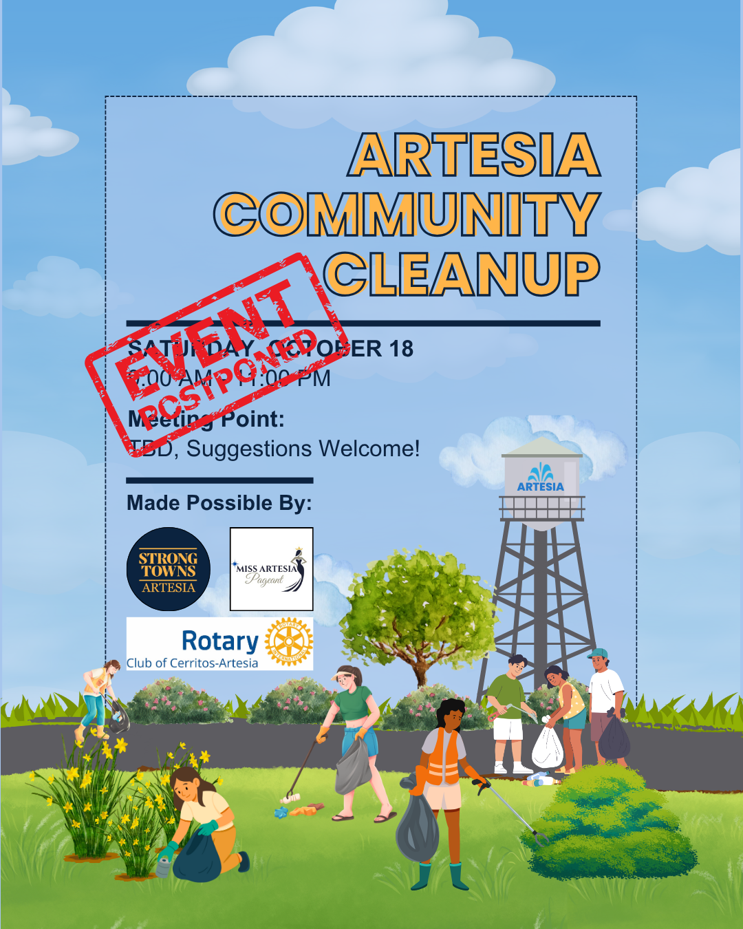 Strong Towns Artesia, Miss Artesia Pageant, and the Cerritos Artesia Rotary Club is hosting another Community Cleanup, a great way to make a direct impact, meet neighbors, and take pride in our city.