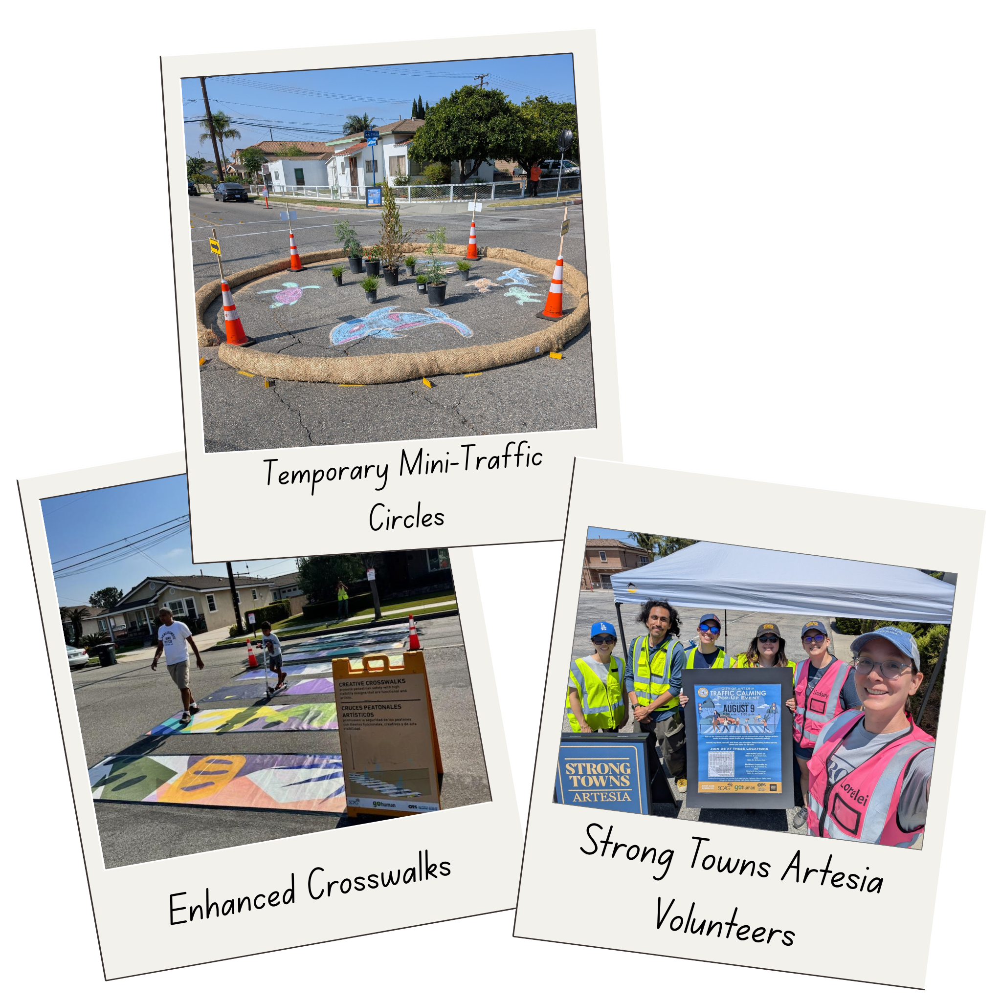 In August 2025, Strong Towns Artesia partnered with the City of Artesia to host the community’s first-ever traffic calming demo. We installed two temporary mini-traffic circles and enhanced crosswalks, giving neighbors the chance to experience safer street designs firsthand.
